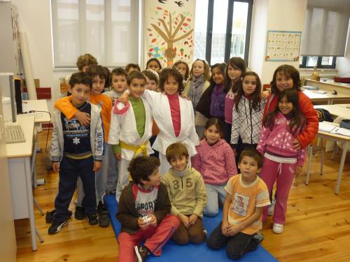 No âmbito do projecto de turma “O que sei e vou partilhar…” a Rita e o Alberto, ambos judocas, deram uma aula de Judo aos colegas da turma.  Fizeram a exploração oral de um texto por eles elaborado sobre a criação, história e significado do Judo e entregaram um questionário aos colegas, para verificarem se estes tinham “aprendido a lição”. Em seguida, executaram e ensinaram algumas técnicas de Judo, num tapete improvisado para o efeito. Foi uma aula excelente, diferente e bastante proveitosa para todos.
