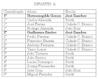 Este encontro decorreu nas instalações da Escola Cidade de Castelo Branco, em Castelo Branco, que contou com 43 xadrezistas, tendo o nosso Agrupamento participado com 7 alunos, repartidos pelas quatro categorias. Todos demonstraram uma grande atitude competitiva, destacando-se os alunos Hermenegildo Gomes, Alexandre Serra e Luís Duarte, que ocuparam o 1º lugar nas respectivas categorias: Infantis A, Infantis B e Juvenis. A seguir apresenta-se a lista completa com a classificação deste torneio.